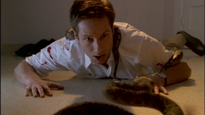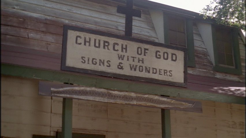7×09 Signs and Wonders je jedna z těch „neviditelných“ epizod, kterou si mnoho fanoušků vůbec nepamatuje. Scénárista Jeffrey Bell vyslal Muldera a Scullyovou do městečka Blessing v americkém Tennessee, aby zde zahájili vyšetřování uvnitř tajemné církve Church of God with Signs & Wonders. Musím se přiznat, že podobné náměty mě velmi přitahují, ať už z toho důvodu, že se příběh odehrává v mém oblíbeném americkém jižanském státu, nebo proto, že agenti zde odhalují temné praktiky pokud možno ještě temnější náboženské sekty. Všechno to jsou témata, která bez větších problémů vydají na skvělý thriller a mě tak během sledování zamrzely jen dvě věci. Jednak je velká škoda, že epizoda nemohla být delší – 44 minut je na odvyprávění podobného příběhu opravdu krátká doba a pokud by to celé mělo třeba filmovou délku, bylo by to jen ku prospěchu věci. Zároveň si však uvědomuji, že stěžovat si u epizody seriálu na její stopáž, je vlastně hloupost a podobná výtka není vůči tvůrcům spravedlivá. Druhá stížnost směřuje k některým akčnějším scénám, jenž jsou podle mého soudu občas přehnané. Je mi jasné, že práce s hady je složitá, ale k vystrašení diváka by podle mě stačilo, aby se hadi ve scéně pouze vyskytovali, nemusí se znenadání odkudsi zjevovat a po svých (už tak dosti nebohých) obětech ještě skákat. Ale těžko to popisovat, nejlepší bude, když se na to podíváte sami a tím si vytvoříte vlastní názor.