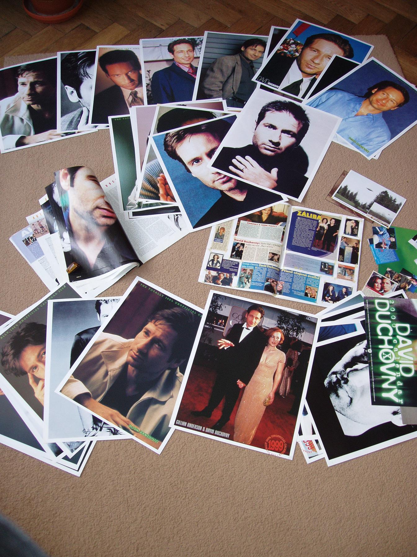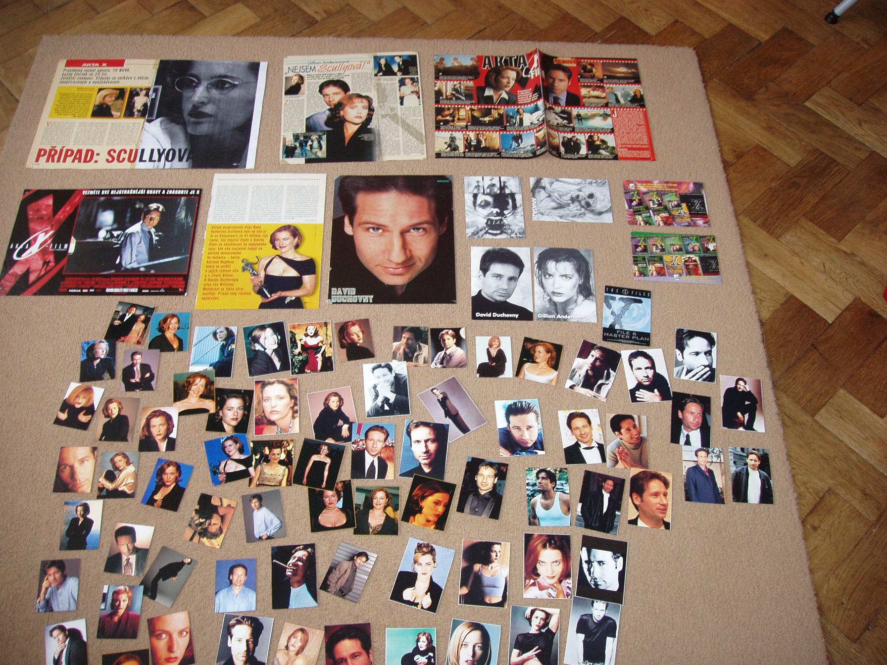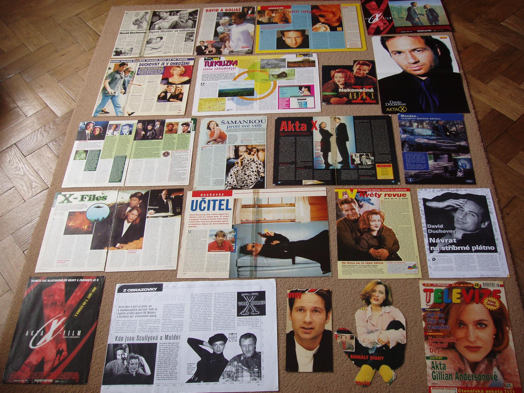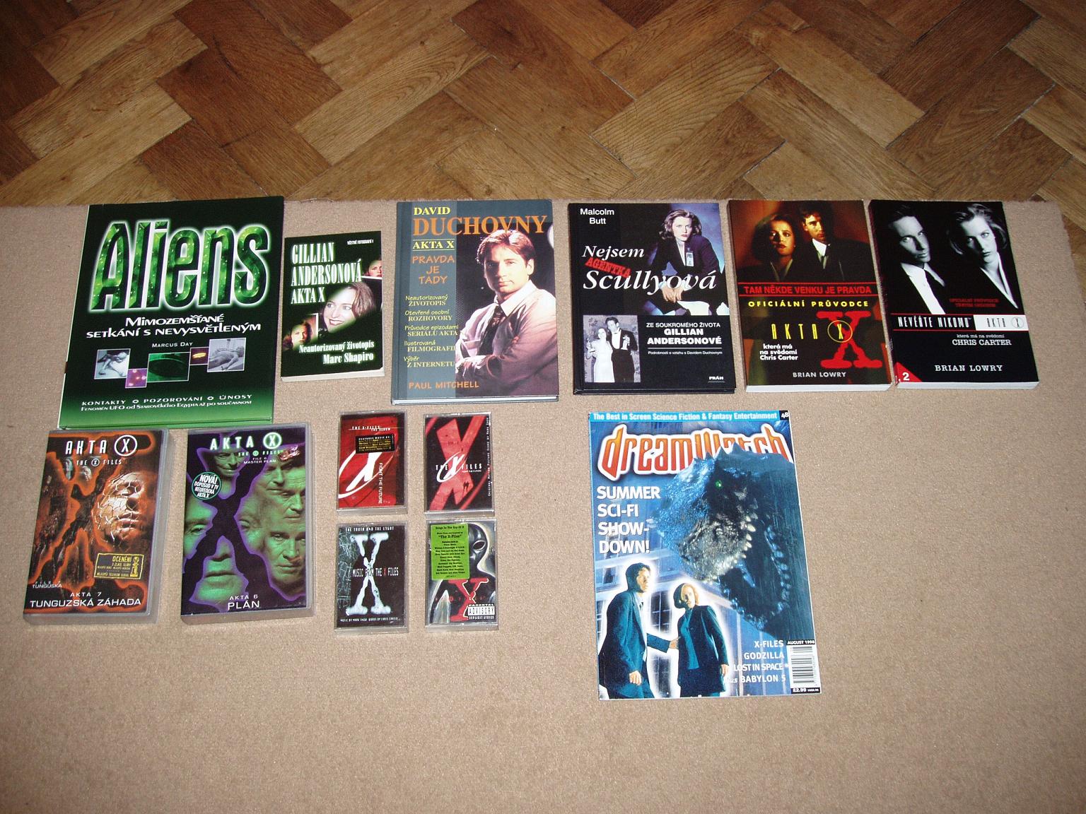 Vedle desítek plakátů a stovek výstřižků bych chtěl upozornit především na dnes již téměř nesehnatelné knihy o Aktech X. Na prvním obrázku v horní řadě můžete vidět dva knižní průvodce, které vás provedou po prvních třech sériích seriálu. Minimálně stejně zajímavé jsou knihy o obou hercích – David Duchovny: Pravda je tady a Nejsem agentka Scullyová: Ze soukromého života Gillian Andersonové. Obě knížky obsahují velmi pěkné fotografie a lehce bulvární zákulisní informace z natáčení Akt X. Pokud vás některá z věcí zaujala, další informace zjistíte na e-mailové adrese helaladela [zavinac] gmail [tecka] com.