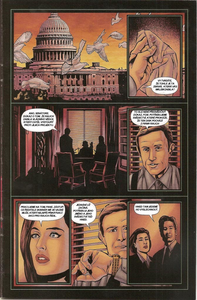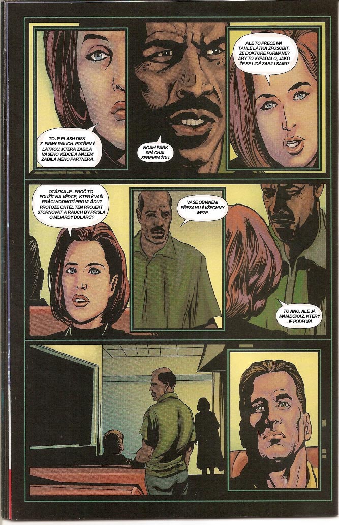 Agentka Scullyová za vydatné podpory ze strany Osamělých střelců a Waltera Skinnera pokračuje ve vyšetřování případu, který se týká tajného vládního výzkumu biologických zbraní. U obětí tohoto experimentu cosi vyvolává nebezpečné paranoidní stavy, a tak když je nakonec postižen i agent Mulder, musí jeho partnerka jednat skutečně rychle. Jak vše dopadne, to už se dozvíte díky scanům na následujících řádcích. Do komentářů pod článkem se určitě nezapomeňte podělit o své dojmy a případné zajímavosti, které se vám během pročítání komiksu podaří nalézt.