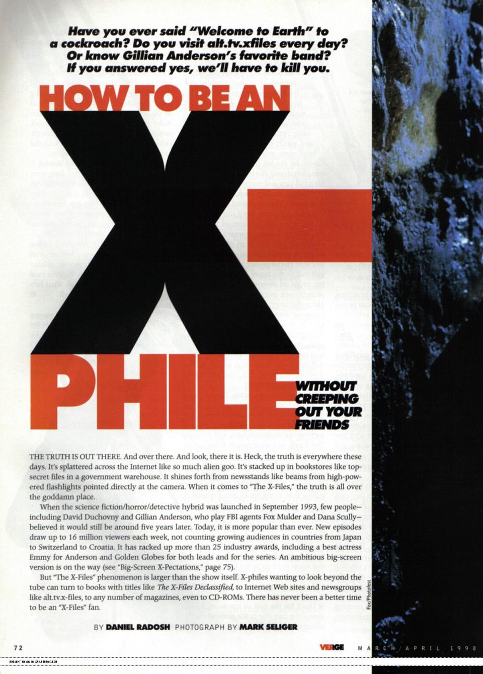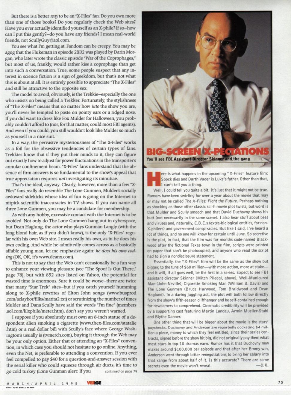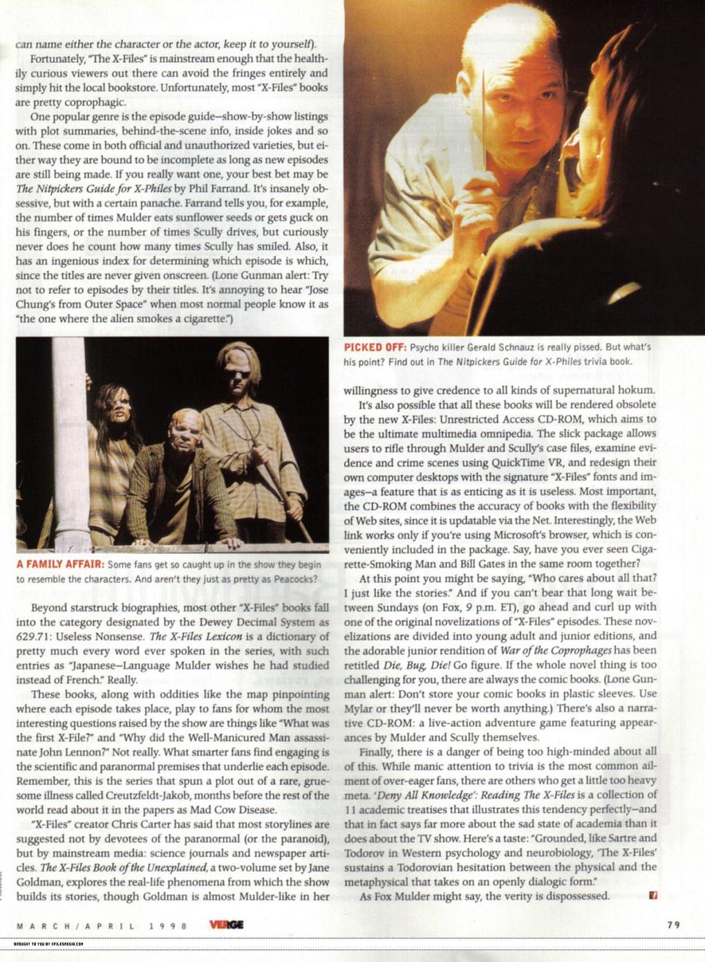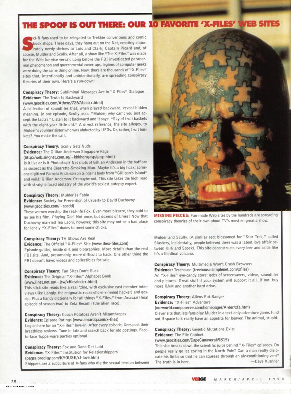 Americký server xfilesmedia.com nabídl všem fanouškům Akt X možnost přečíst si článek z téměř jedenáct let starého vydání časopisu VERGE. Najdete v něm plno zajímavých informací, zodpovězených otázek i internetových adres, které v té době fungovaly.