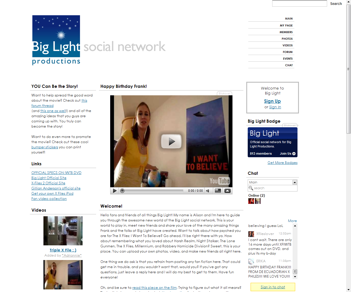 Na tomto místě však nebudu vymýšlet žádné vlastní přání, nýbrž vás odkáži na video, které mi zaslala slovenská fanynka xloverin. Ta společně s dalšími kamarádkami vytvořila vskutku originální videoklip, kterým Frankovi popřála vše nejlepší. To ale není vše – video se Frankovi asi líbilo natolik, že na svém webu uvedl nejen celé znění e-mailu od holek, ale zveřejnil také videoklip – a to rovnou na titulní stránce (v náhledu YouTube videa o pár řádků níže můžete vidět přímo xloverin). Tato oddaná fanynka se s Frankem navíc již setkala osobně, stalo se tak na londýnské premiéře druhého filmu. Pro více informací si přečtěte aktualitu Londýnská premiéra filmu Akta X 2 (xloverin).