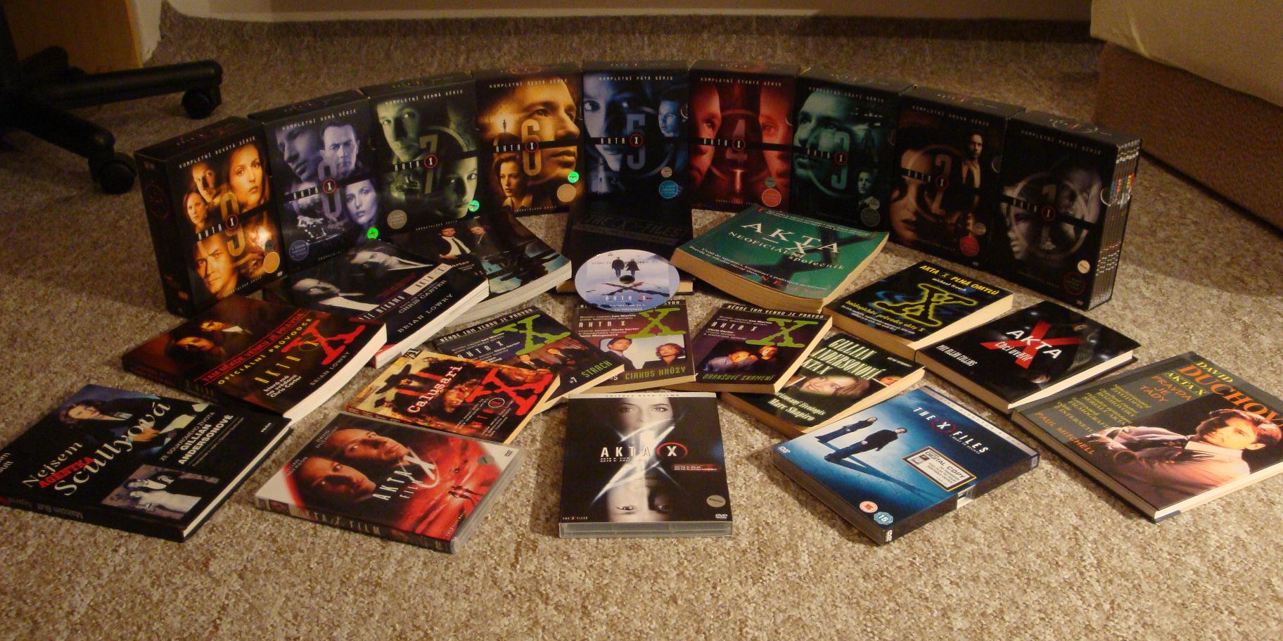 Rozhodl jsem se také trochu přispět do naší neustále se rozšiřující rubriky Fandom a vyfotil jsem svoji sbírku DVD, knih a dalších drobností s tématem Akt X. Na svou sbírku jsem velmi hrdý, ale musím se přiznat, že z velké části mi s ní pomohl můj bratr Honza, který v devadesátých letech prožíval Akta X společně se mnou a zakoupil první dva knižní průvodce (které považují za úplný základ). Knihu Nejsem agentka Scullyová: Ze soukromého života Gillian Andersonové jsem zase získal od svého bratrance Lukáše. Jestli ji chce zpátky, to netuším, ale i kdyby chtěl, dostane ji jen přes mou mrtvolu… ;) Určitě se neostýchejte nafotit svoji vlastní sbírku a zaslat mi ji. Stoprocentně zde bude zveřejněna, stejně jako tomu bylo již v případě níže uvedených fandů. V závěru chci ještě poděkovat svému vzácnému bratrovi za spolupráci a za půjčení foťáku… :)