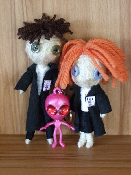 KayTee, která pro náš web v minulosti napsala čtveřici vynikajících povídek Žárlivost, Návrat, Rakovina a především originální Shledání, se rozhodla, že si vytvoří vlastní agenty FBI. Její Mulder a Scullyová však nejsou z masa a kostí, ale z obyčejných klubíček. Skvostně vypadající výrobky si můžete prohlédnout na řádcích níže. Jak můžete vidět zde, velikost těchto půvabných voodoo panenek není nikterak závratná. Pohled na celé postavičky i s nezbytným mimozemšťánkem je zde, detail sexy tváře zrzavé agentky Scullyové zde… :)