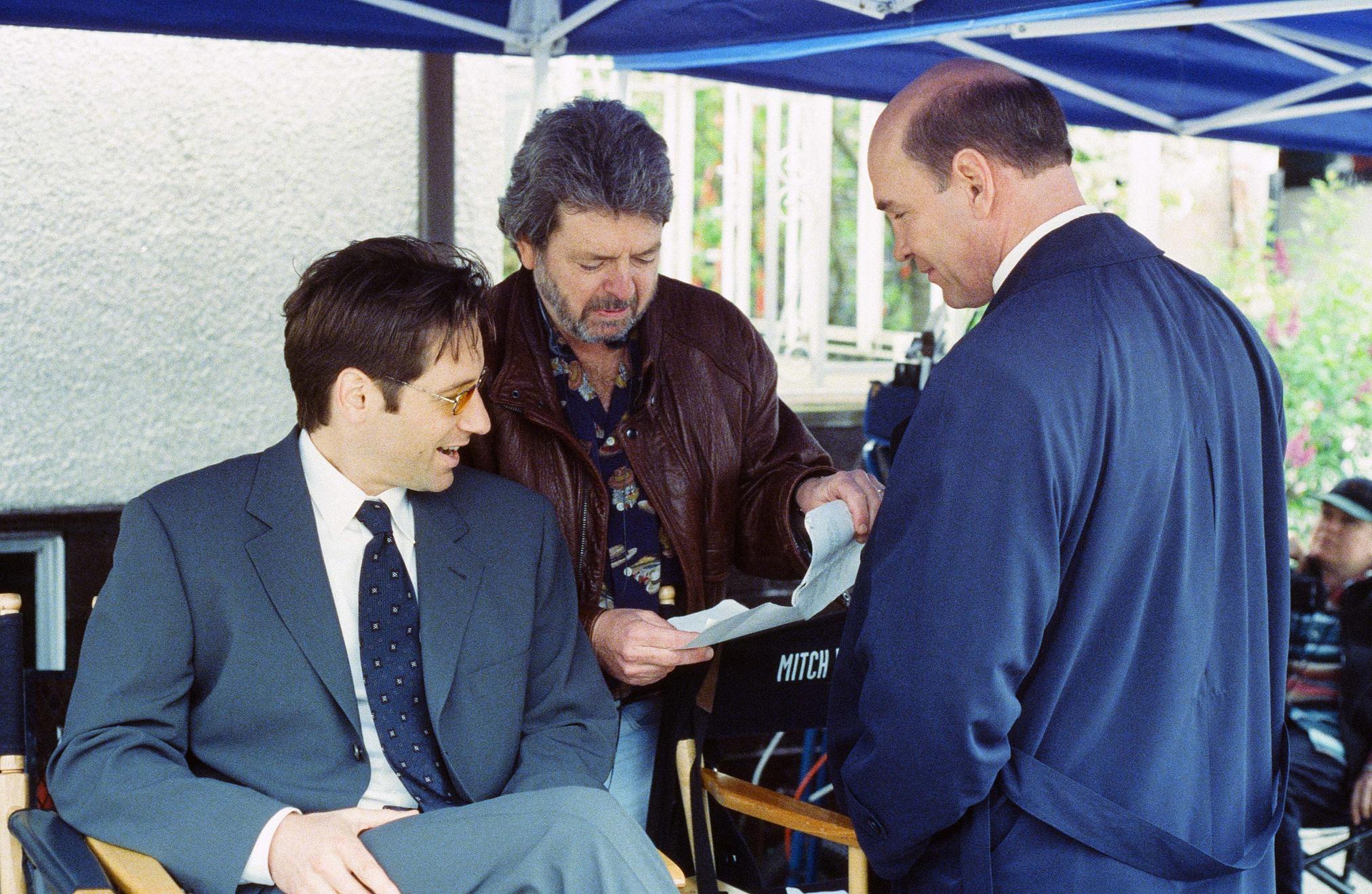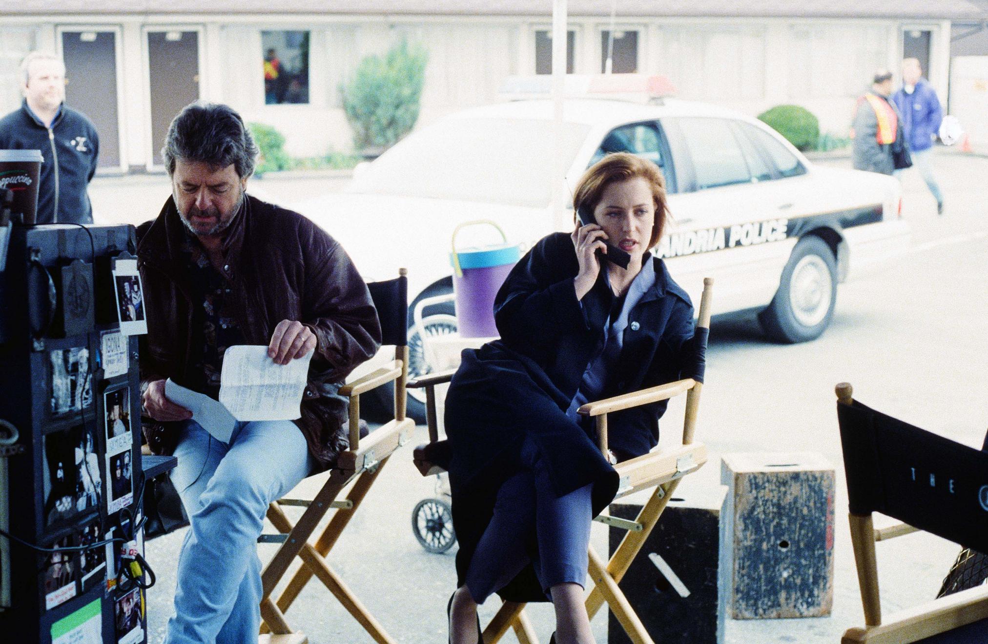 Další fotky si můžete prohlédnout po kliknutí na následující odkazy. Na prvních dvou fotografiích můžete vidět režiséra R.W. Goodwina, který si vzal na starost i tuto epizodu. Na první fotce ho najdete vedle Davida Duchovnyho a na druhé ve společnosti telefonující Gillian Andersonové. Připomínám, že Goodwin režíroval jedny z nejslavnějších mytologických epizod prvních sérií (jen namátkou The Erlenmeyer Flask, One Breath, Anasazi, The Blessing Way, Talitha Cumi, Gethsemane či Redux) i mimozemskou sci-fi komedii Alien Trespass s Robertem Patrickem v hlavní roli. Na poslední fotce z natáčení The End naleznete už jen osamělého Mitche Pileggiho.
