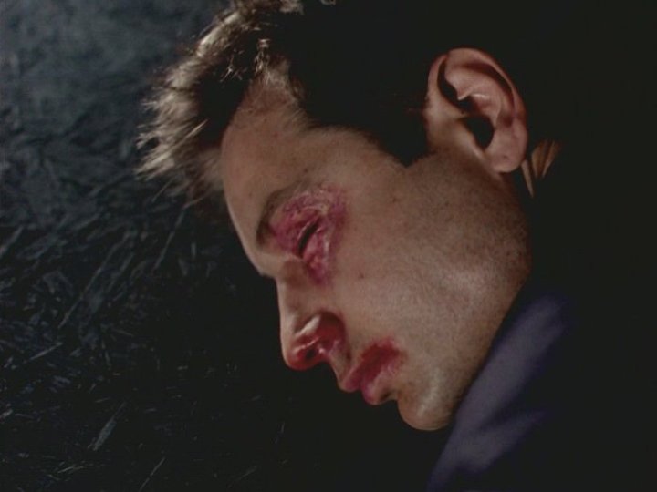 A přesouváme se k Mulderovi a jeho nekonečné řadě šrámů, rvaček, střelných poranění a mimozemských chřipek. Že je Mulder zvědavec, který se cpe, kam nemá a doplácí na to je jasné hned ve druhé epizodě seriálu, kde je na něm proveden zákrok selektivního vymazání paměti a on má posléze takové okno, že si nepamatuje ani kde to vlastně je (obrázek zde). První zářez, symbolický i do těla, mu způsobí ďáblice z Jersey (zde), ale opravdové vážnější zranění přijde v Beyond the Sea, kde je postřelen do levého stehna a vypadá to s ním bledě (Nebyl snad varován, aby si dal pozor? To víte, že byl! A poslechl? To víte, že ne!) (obrázek zde). Mezitím si však ještě zkusil chodit o berlích s pochroumanou nohou a nadýchat se kouře. O výletu za hmyzem už řeč byla. Ve finále první řady ho pravda málem stojí život, když ho zbijí vládní vojáci a výměnou za jeho život žádají „původní tkáň“ (obrázek zde).