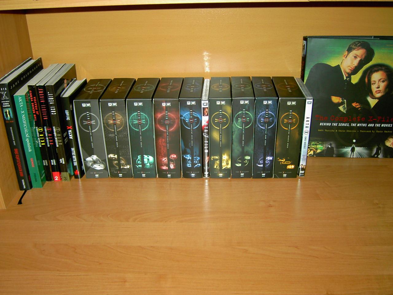 Radek zaslal několik fotek své rozsáhlé sbírky s materiálem týkajícím se seriálu Akta X. Sbírka sice obsahuje několik důležitých knih i kompletní seriál na DVD, zlatým hřebem však bezesporu zůstává kniha The Complete X-Files: Behind the Series, the Myths, and the Movies (více zde). Tato nejnovější kniha ze světa Akt X by neměla uniknout žádnému fanouškovi. Smutným faktem však zůstává, že českým x-philes nezbývá, než si knihu objednat z některého ze zahraničních internetových obchodů. Radek se jí (a bonusům, které spolu s knihou vycházejí) na fotkách alespoň o to více věnoval.