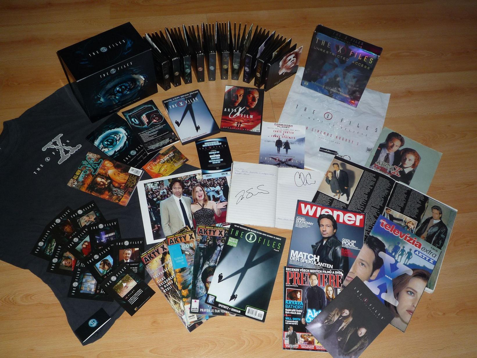 Se svojí obrovskou sbírkou DVD setů, knížek, komiksů, plakátů a dalších předmětů s tématem Akt X přispěla také xloverin. Na třech následujících obrázcích stojí za povšimnutí především krásný autogram od Chrise Cartera a Franka Spotnitze, který tato oddaná slovenská fanynka dostala na britské premiéře druhého celovečerního filmu. Vše podstatné si ostatně můžete přečíst sami v článku Londýnská premiéra filmu Akta X 2, který xloverin napsala v červenci 2008. Když už jsem zmínil tento článek, nesmím opomenout ani její povídky, kterých se na našem webu objevilo zatím šest: Dobře připravený shipper, Nikdy sa nehraj na kaskadéra, Nedotknutelné věci, Sticky Notes, Made Perfect a Noc s Murphym. Ale zpět ke sbírce: krom autogramu na první fotce najdete i Ultimate Xphiles 9 Season Collection a 3DVD edition IWTB. Další drobnosti se vám zobrazí po kliknutí na náhledy níže.