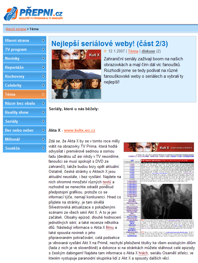V posledních měsících a letech byl náš web několikrát zmíněn v českých i slovenských médiích, ať už na internetu nebo v tištěných časopisech. Český filmový magazín Premiere ve svém červencovém čísle z roku 2008 zařadil Kult X mezi čtyři nejpovedenější weby o televizních seriálech. Náš skromný web se tak dočkal stejného ocenění jako např. lost.cz, což jsou další špičkové internetové stránky, v tomto případě o seriálu Lost.